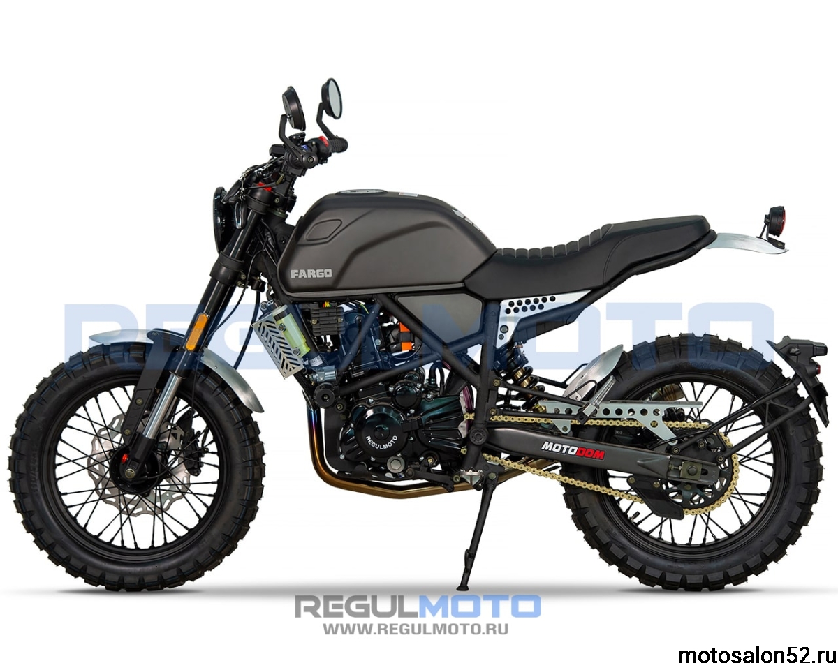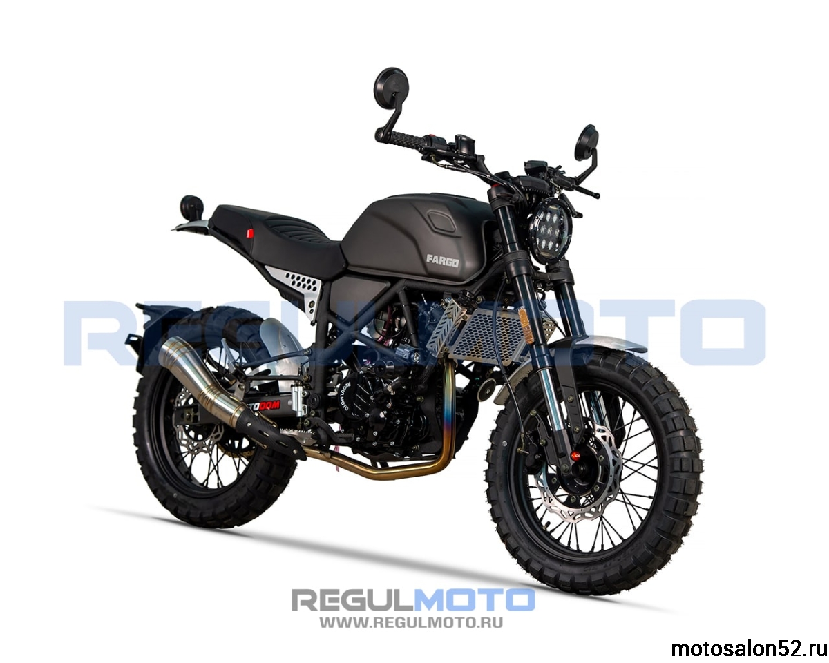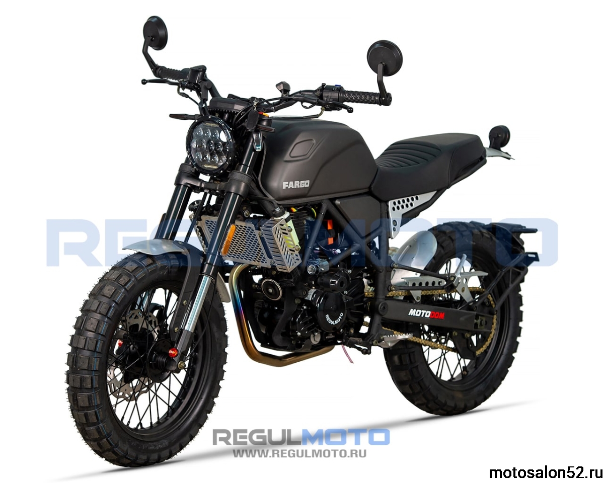 Regulmoto Fargo 300 — редкий случай, когда в одном мотоцикле идеально сочетается стиль и функциональность. Это настоящий скремблер — мотоцикл, построенный на базе лёгкого городского байка, приспособленного к передвижению вне дорог за счёт установки более длинноходных подвесок и внедорожных шин.