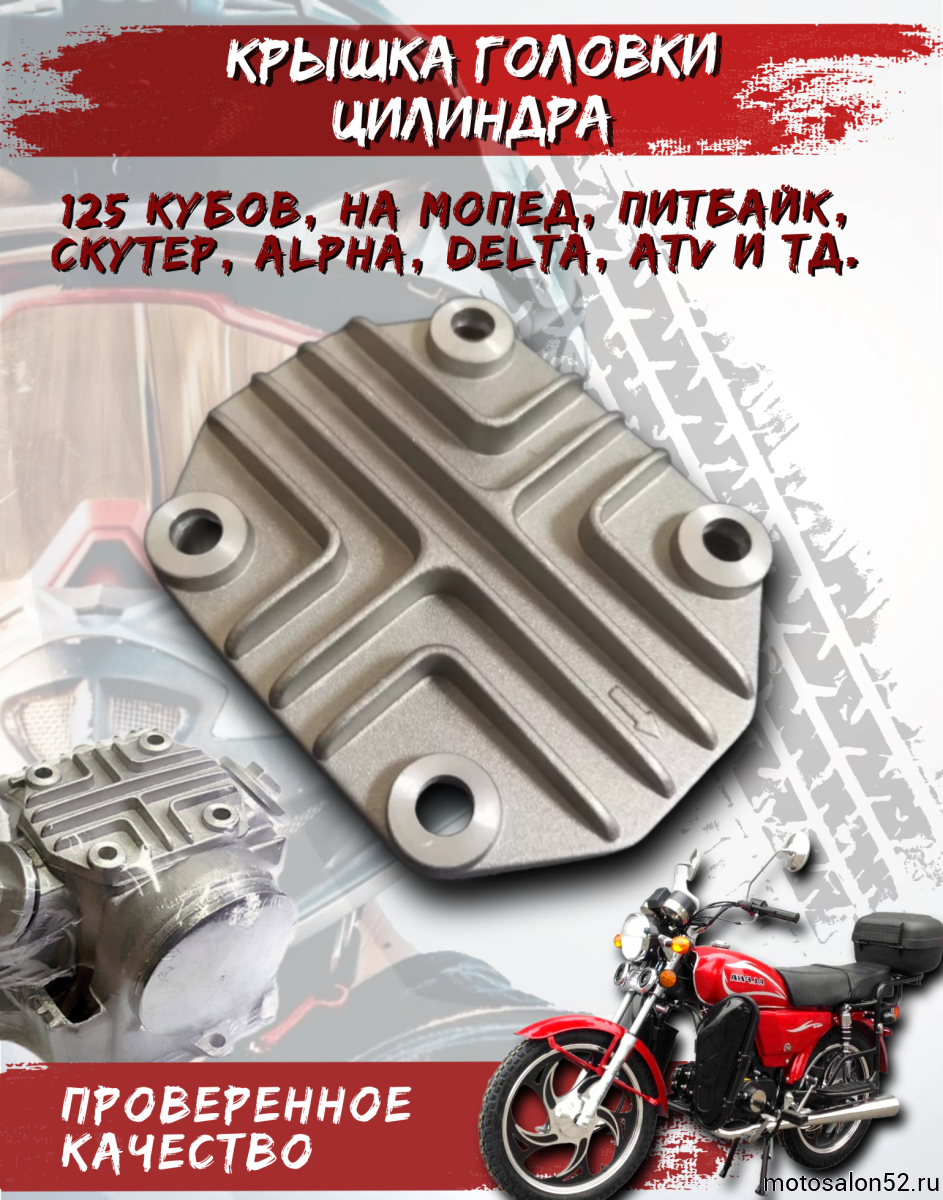 Данная запчасть представляет собой незаменимый элемент для двигателя вашего мопеда. Крышка головки цилиндра обеспечивает надежную работу двигателя на мопед, альфа 110 дельта или на детский квадроцикл до 125 сс (куб). Это неотъемлемая деталь для обслуживания и ремонта мопедов и детских квадроциклов. Используется в приборке на мопеды различных моделей.